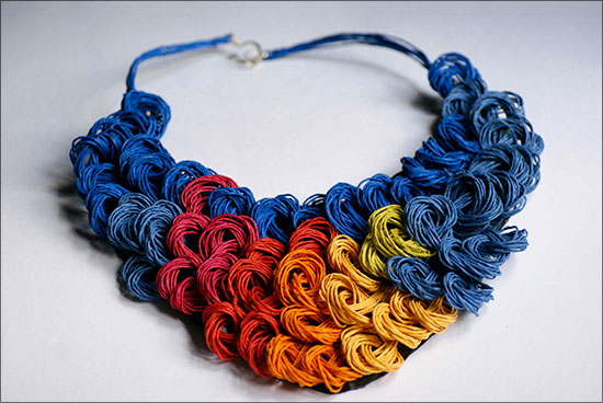 This truly international exhibition features work from every continent and many sub-continents. Artists range from mature artists with international reputations to students still learning their craft. Many of these artists focus on the use of “green” materials, and explore the re-use or “upcycling” of materials into wearable art.
