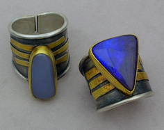 Boulder opal flared cuffs: Bold sterling cuffs accented with boulder opals set in 22K gold.
